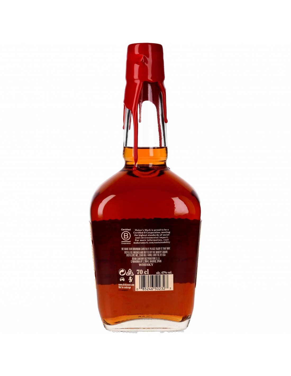 Maker's Mark, une aventure commencée avec l'unique bouteille d'une recette familiale vieille de 170 ans. Cette maison emblématique produit uniquement des bourbons en petits lots (Small Batch), pas plus de 19 fûts à la fois. Dès sa création en 1958, les bouteilles furent capsulées d’un enrobage en cire rouge coulé à la main, sa marque de fabrique. Ce faisant, il n'y a pas deux trempages identiques. Comme autre particularité, le blé remplace le traditionnel seigle et son âge n’est pas déterminé, il doit simplement vieillir au minimum deux ans pour être qualifié de Straight Bourbon.