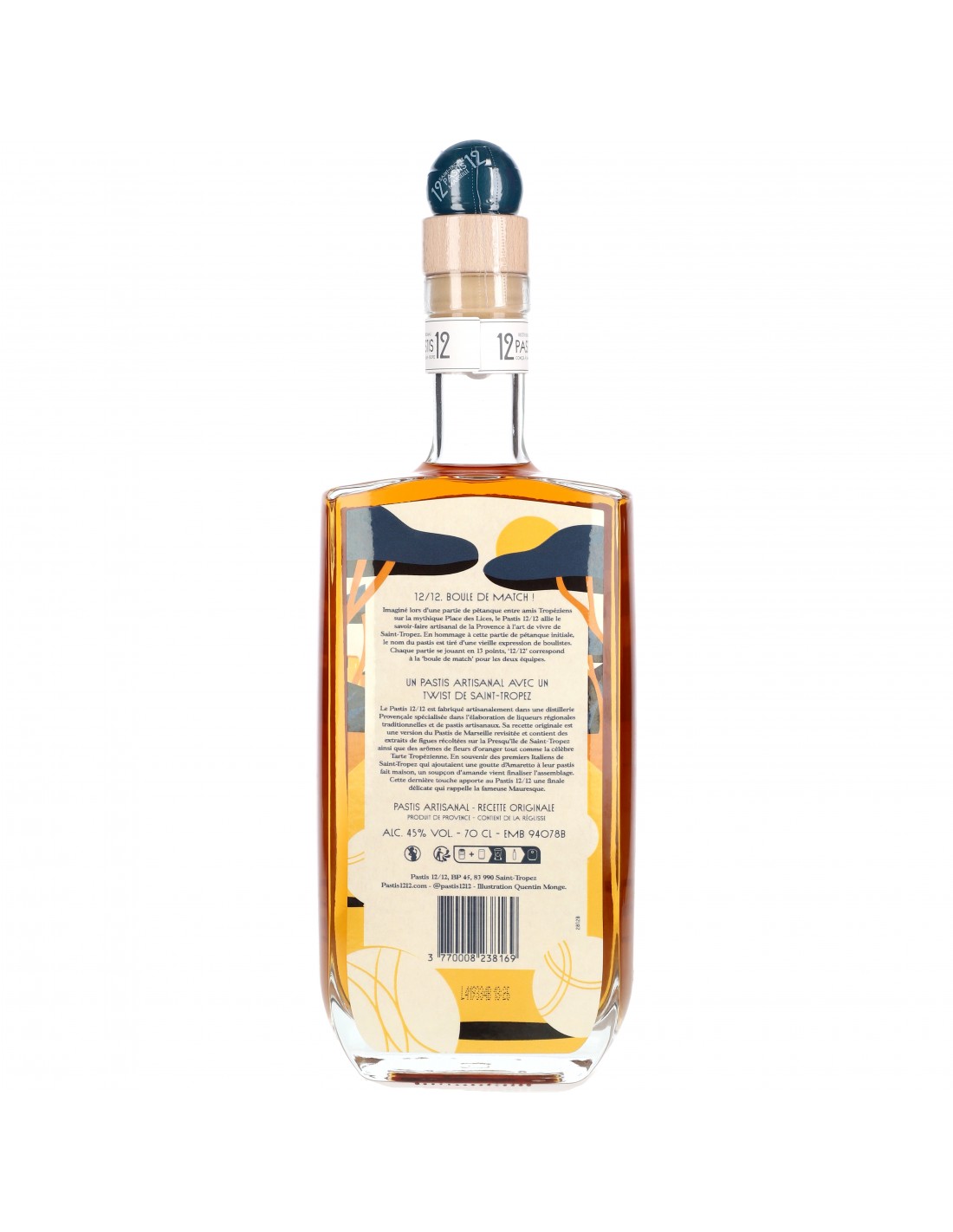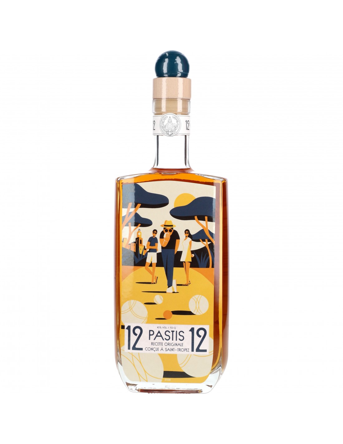 N’en déplaise aux marseillais, Saint-Tropez est également une grande ville de Pastis et de pétanque. Pastis 12/12 redonne vie à cette tradition locale avec un pastis de connaisseurs, chic et artisanal. Les boulistes de la Place des Lices se reconnaitront sur les belles étiquettes illustrées par l'artiste Quentin Monge ; sans parler du bouchon-cochonnet, qui en plus de fermer l’élégant flacon se détache pour entamer une nouvelle partie.
