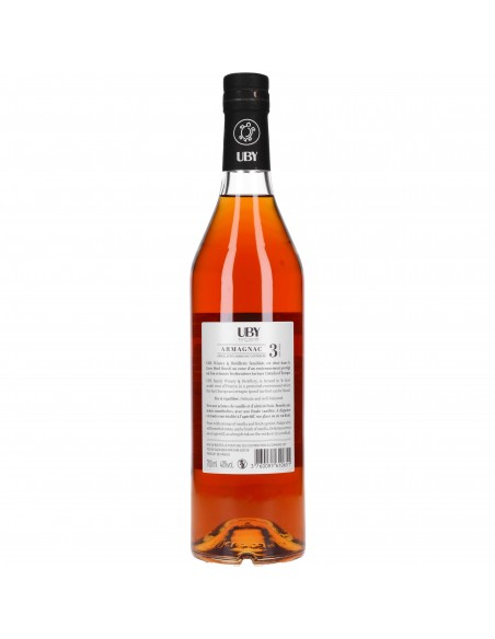 Uby Armagnac 3 ans est issu d’une distillation de Baco et d’Ugni blanc, deux cépages dominant sur l’AOP Armagnac. Le terroir sablonneux apporte de la finesse à l’assemblage, l’élevage sur lies fines du gras et de la complexité aromatique. Les vins sont ensuite distillés en alambic traditionnel à simple chauffe et le vieillissement se déroule en fût de chêne.