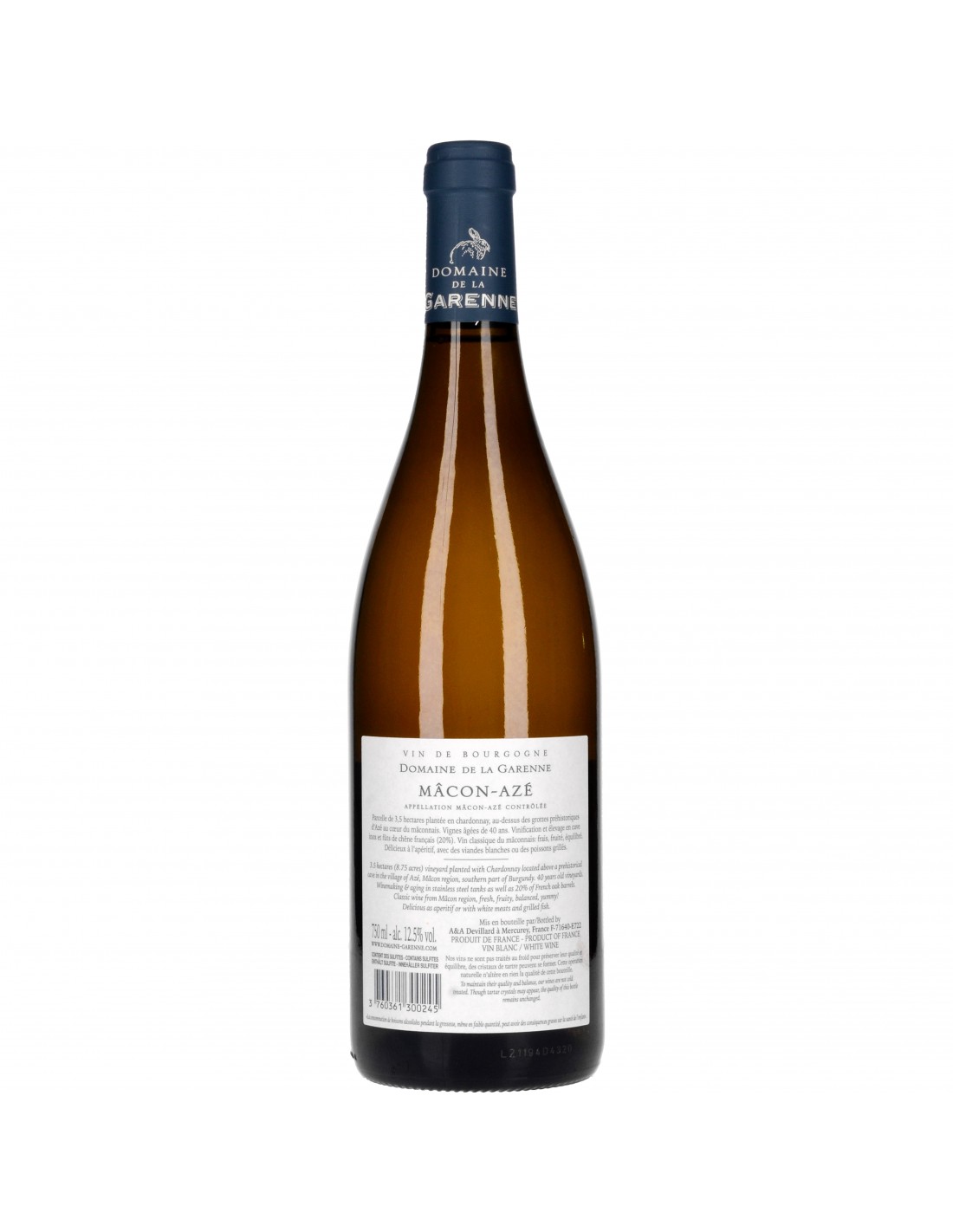 Situé sur les hauteurs de la commune d’Azé, le vignoble de 4,5 hectares bénéficie d’un très bel ensoleillement, exposé au Sud-Est sur une voûte calcaire. Les raisins sont vendangés à la main, triés manuellement et totalement égrappés. Fermentation alcoolique en cuve inox à basse température, fermentation malolactique complète. Le vin est élevé pendant 12 mois en cuve inox, sur lies fines.Le Domaine de la Garenne est cogéré par les familles Beaumont et Devillard.