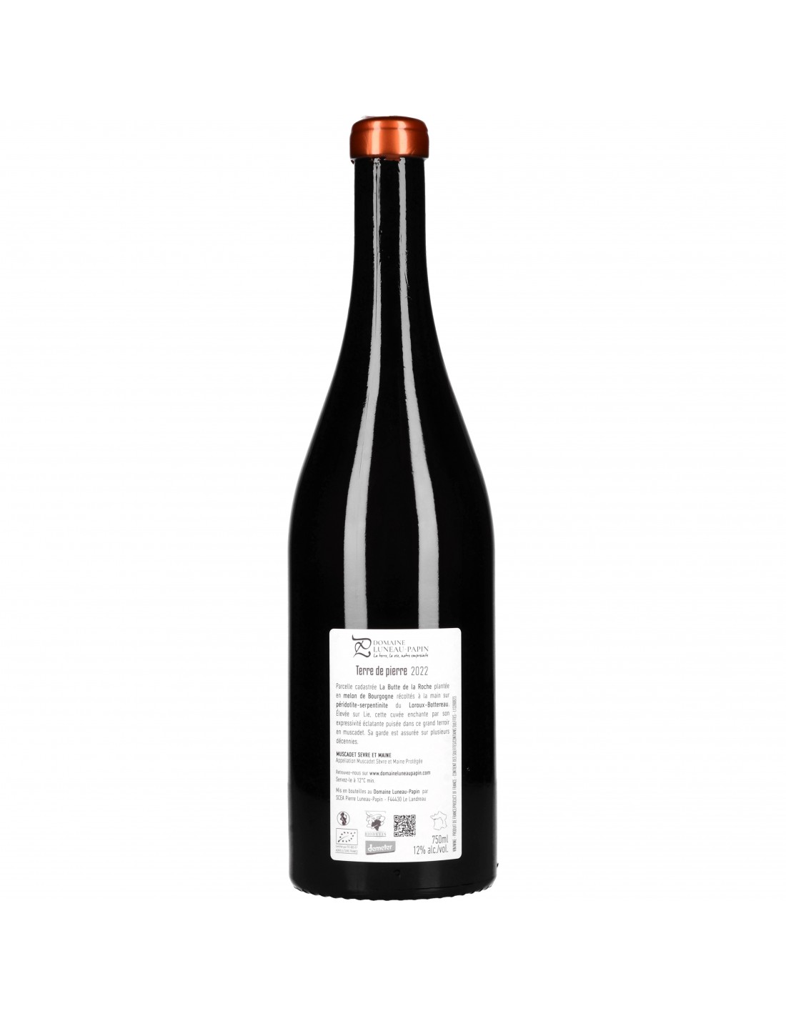 " Terre de pierre nous enchante par son expressivité éclatante, la salinité de ce vin est absolument vivifiante. Un style à la fois classique et dynamique, qui pare le vin pour plus de dix ans de garde." Alexis Goujard de la Revue du Vin de France au sujet du millésime 2021Le Domaine Luneau-Papin est situé sur la commune de Le Landreau, au cœur de l'appellation Muscadet Sèvre et Maine. Dirigée par Pierre-Marie Luneau, cette propriété appartient à la même famille depuis le XVIIe siècle. Le vignoble de 40 hectares, réparti sur les coteaux du Sèvre et Maine, est planté de Melon de Bourgogne, un cépage originaire de la région éponyme, qui a trouvé son fief dans le pays nantais au XVIIe siècle. Dès les années 2000, l'exploitation s'engage dans une conversion à l’agriculture biologique et biodynamique, certifiées des labels AB Ecocert depuis 2016, Demeter et Biodyvin en 2019.