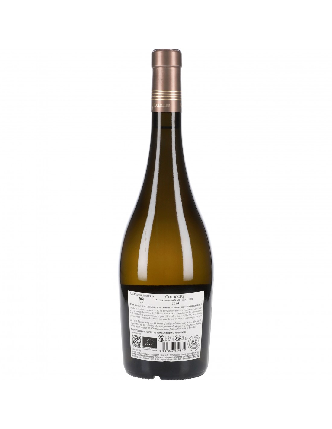 Créé en 1800 par la famille Bernardi, Le clos de Paulilles est racheté en 2012 par le domaine Cazes. Le vignoble se situe à Collioure sur des terres autrefois cultivées par les moines de l'abbaye de Saint-Génis-des-Fontaines. Le domaine, engagé en agriculture biologique, préserve l'équilibre du terroir tout en produisant des vins qui reflètent l'âme et le caractère unique de la région.Les raisins biologiques, issus des vignes exposées au soleil méditerranéen, sont récoltés à la main. À la cave, les grappes sont soigneusement triées et pressées, puis le moût est fermenté dans des cuves en acier inoxydable. Une fois la fermentation achevée, les vins sont élevés sur lies fines pour enrichir leur structure et leur complexité aromatique. Après un élevage en fûts de chêne français, les vins sont mis en bouteille avec soin. Ce processus méticuleux permet de préserver toute la richesse et l'authenticité des terroirs de Collioure, donnant naissance à des vins fins et élégants.