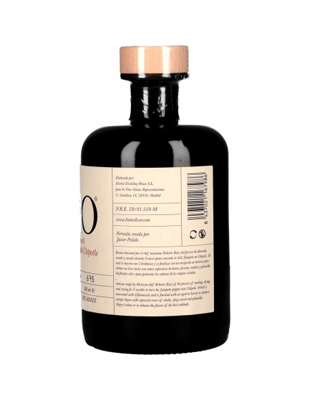 Une liqueur puissante et pimentée, obtenue grâce à la transformation du jalapeno en chipotle. Planté dans un jardin biologique de la région de Ségovie en Espagne, le piment mexicain est fumé, puis séché afin d’en augmenter l’intensité. Après six mois de maturation, les piments séchés macèrent dans de l’alcool de mélasse, auquel on ajoute cinq ingrédients : agrumes, cannelle, cacao, piment de la Jamaïque et thym. Le vieillissement se déroule dans des fûts de chêne ayant contenu du Pedro Ximénez, un vin doux espagnol très sucré. Production artisanale par petits lots d’environ 3 000 bouteilles.