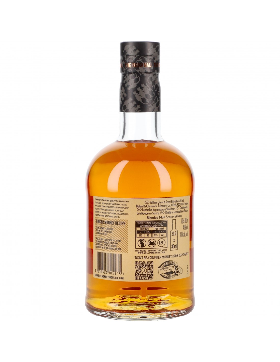 Créé en 2003 par la William Grant & Sons, un mélange de lots provenant des célèbres distilleries Glenfiddich, Balvenie et Kininvie. Le nom Monkey Shoulder (l’épaule du singe) est celui d’une maladie professionnelle ; exposés constamment aux courants d’air en retournant l’orge à la pelle, les Maltmen souffraient de douloureux rhumatismes.