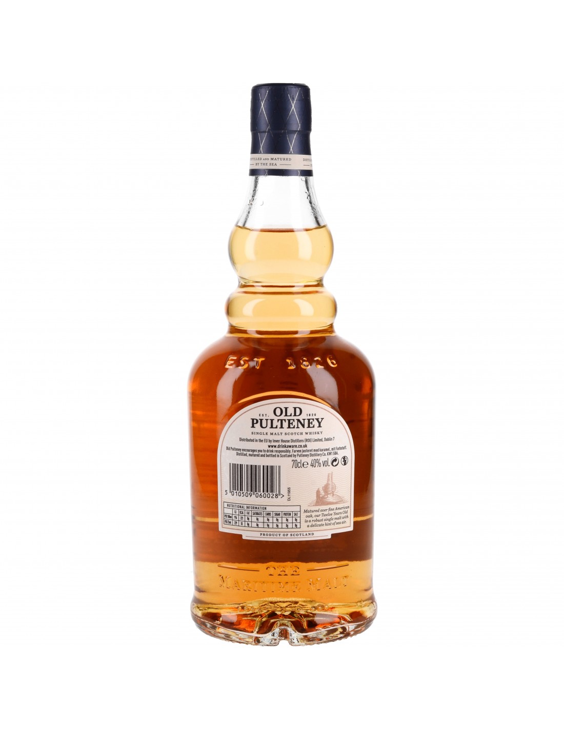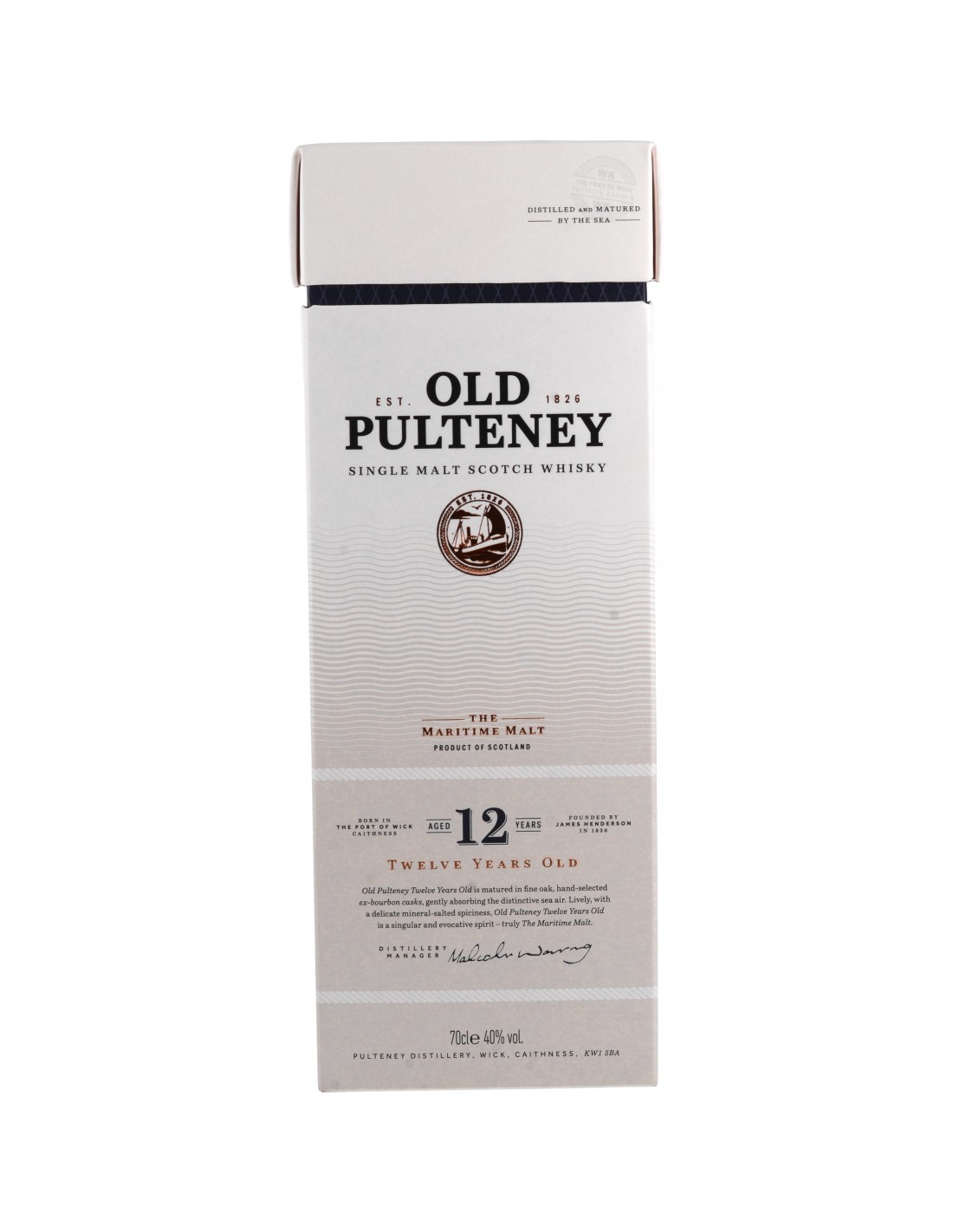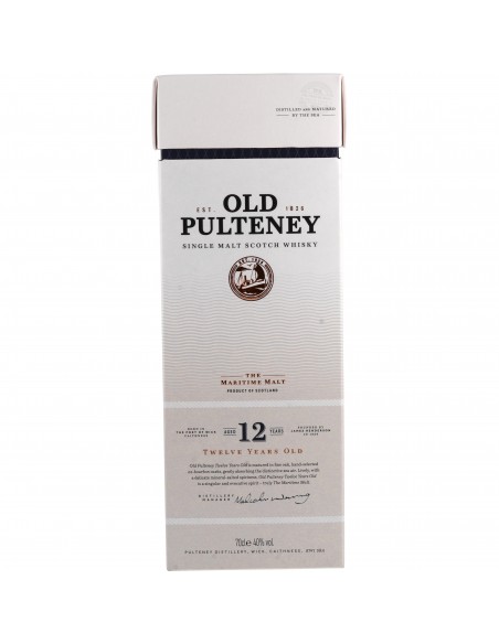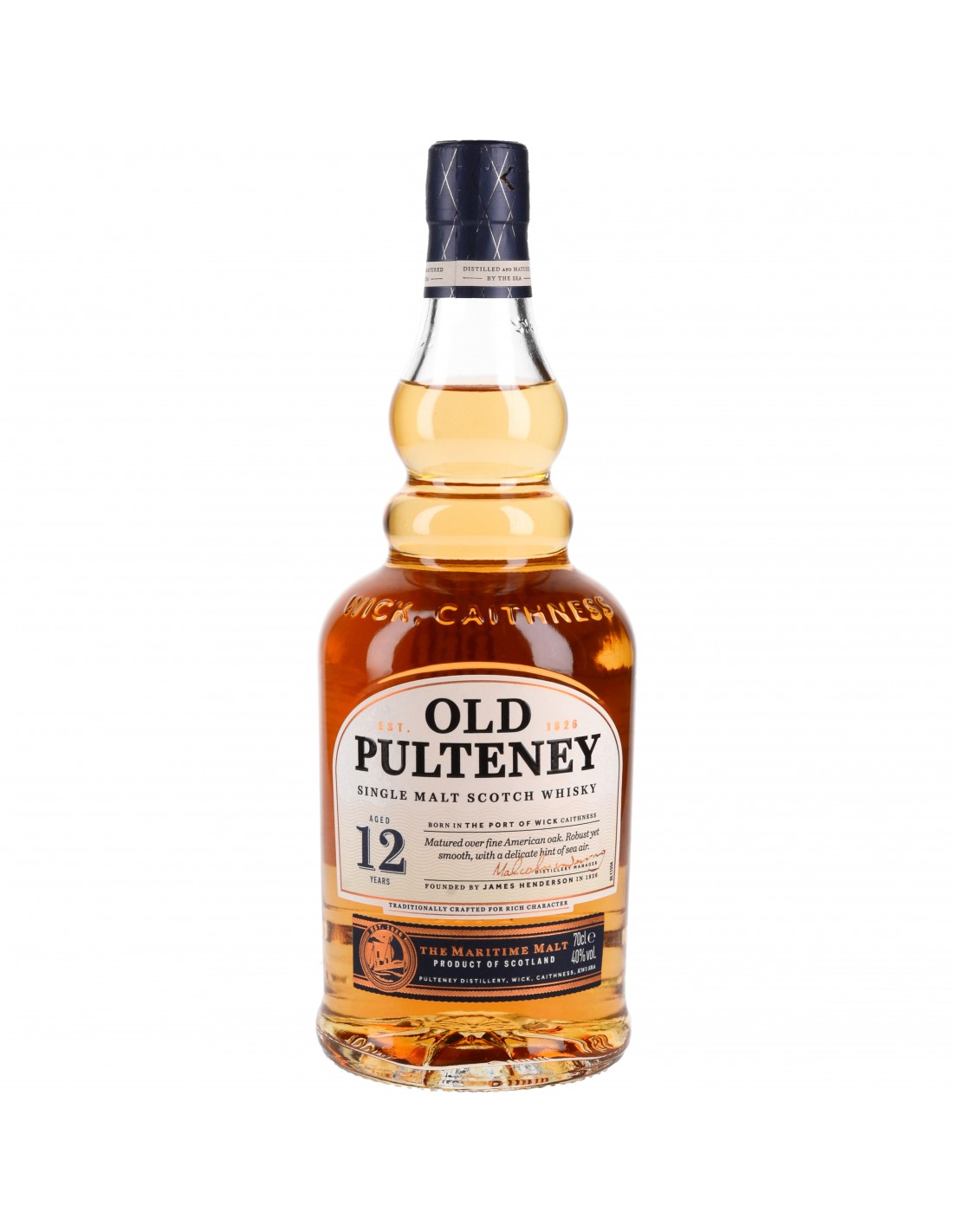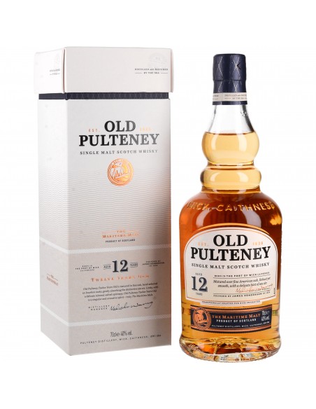 Old Pulteney 12 ans vieilli en anciens fûts de bourbon.Fondée à Wick en 1826, une cité portuaire à l’extrême nord-est de l’écosse, la distillerie Old Pulteney fait partie intégrante de l’histoire maritime de sa ville, autrefois capitale européenne de la pêche au hareng. Dans ce microcosme, les whiskies respirent l'air salin et iodé, un style identitaire faisant la fierté de cet ancien petit village de pêcheurs, dont le développement est intimement lié à celui de sa distillerie.