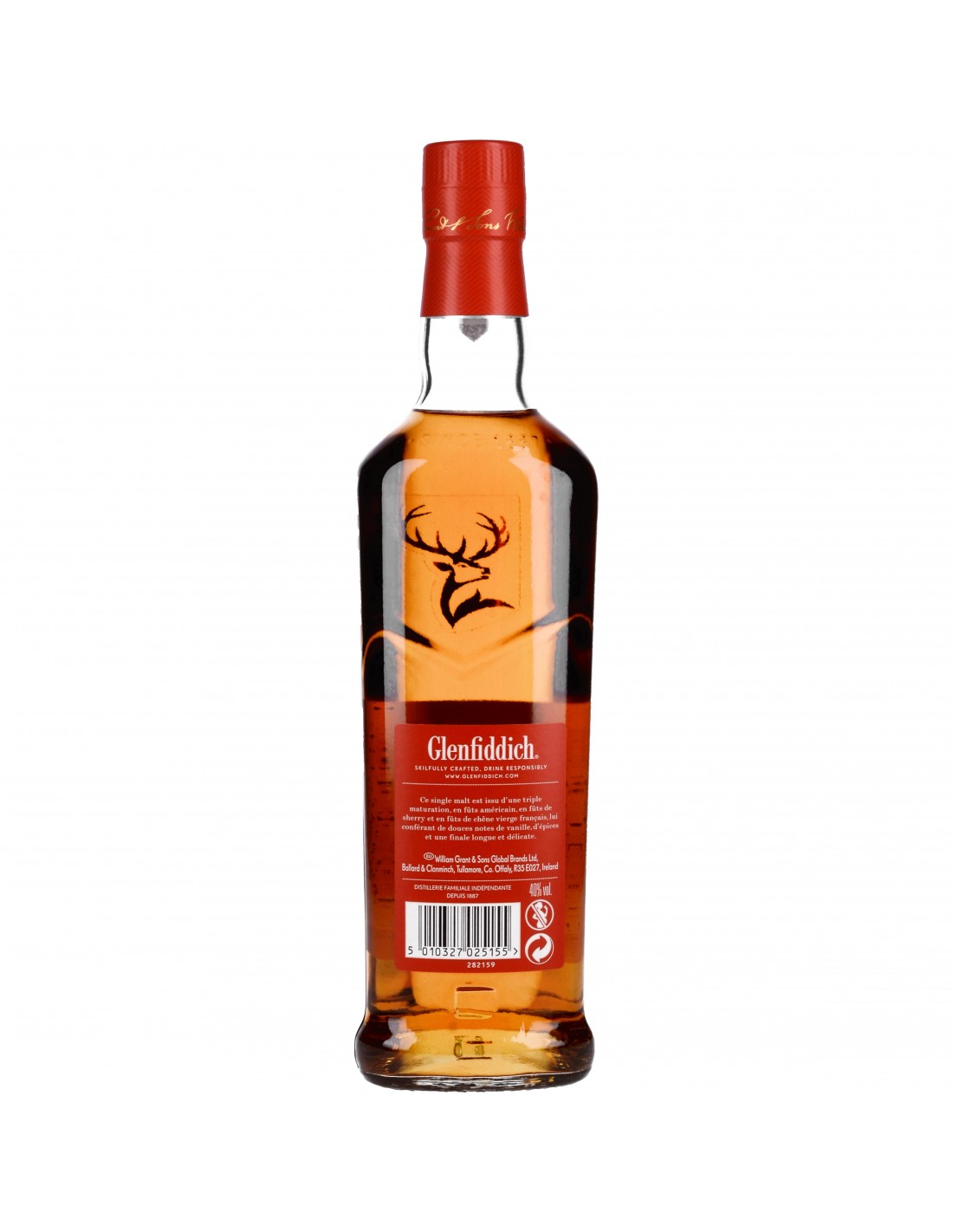 Un Glenfiddich de 12 ans d'âge, vieilli dans une combinaison de fûts de chêne américain et ex-sherry, puis assemblé à un malt élevé en fûts de chêne français neufs. Ce dernier est l’élément clé. Brian Kinsman, employé depuis 1997 et sixième maître de chai de l’histoire de la distillerie, fait le choix de ce type de barrique qui une fois chauffée apporte une belle complexité. Cette triple maturation donne une aromatique intense et un caractère plus typé.
