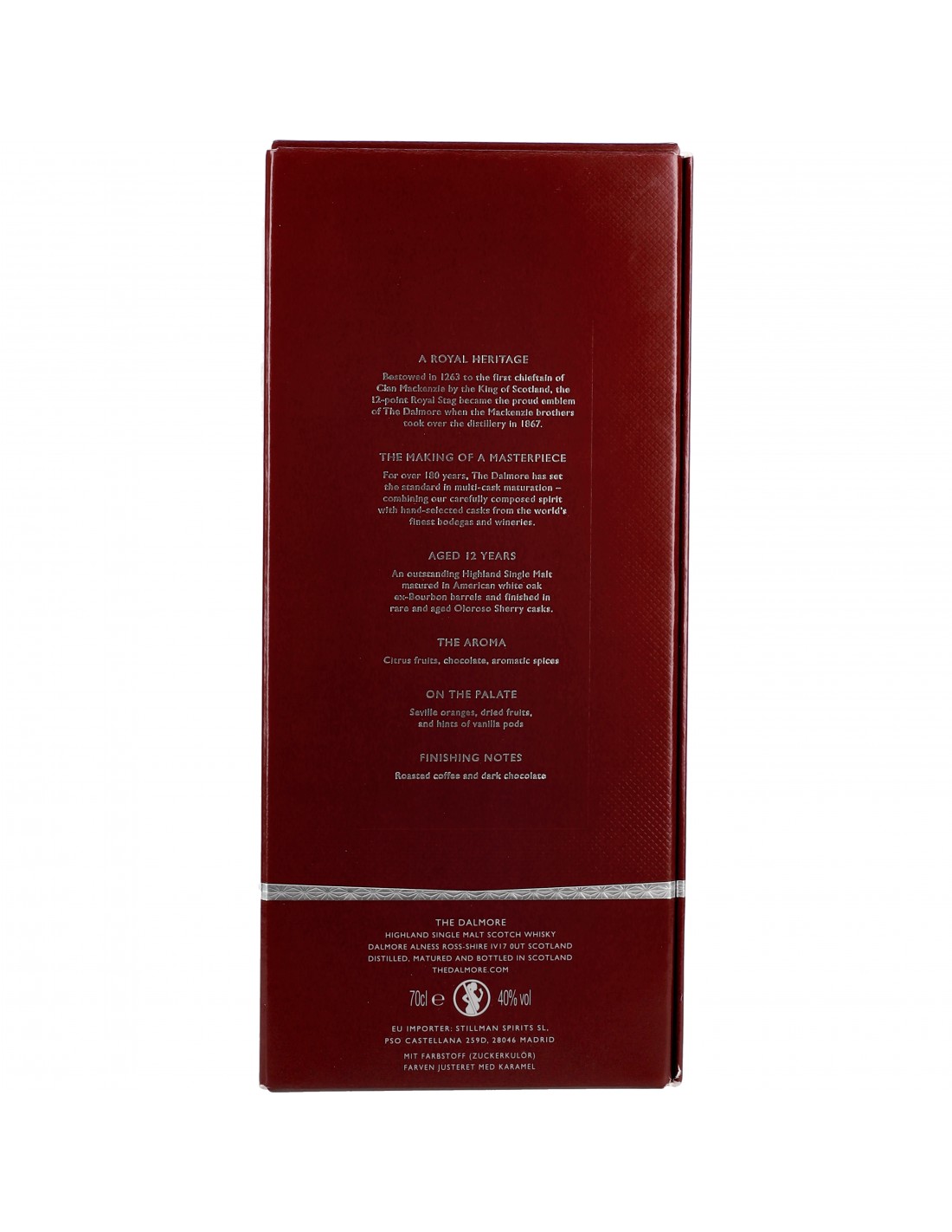 Nous sommes face à l’île noire, une péninsule située au nord-est des Highlands. C’est là que l’on trouve The Dalmore, une distillerie fondée en 1839 par Alexander Matheson dans le village d'Alness. Réputée pour l’équilibre et l’incroyable complexité de ses malts, Dalmore fait preuve d’une maîtrise inégalée des finitions en fûts de diverses origines. La distillerie sélectionne ses fûts de Sherry dans les meilleures bodegas, et importe de vieilles barriques de vin en provenance des vignobles du monde entier.