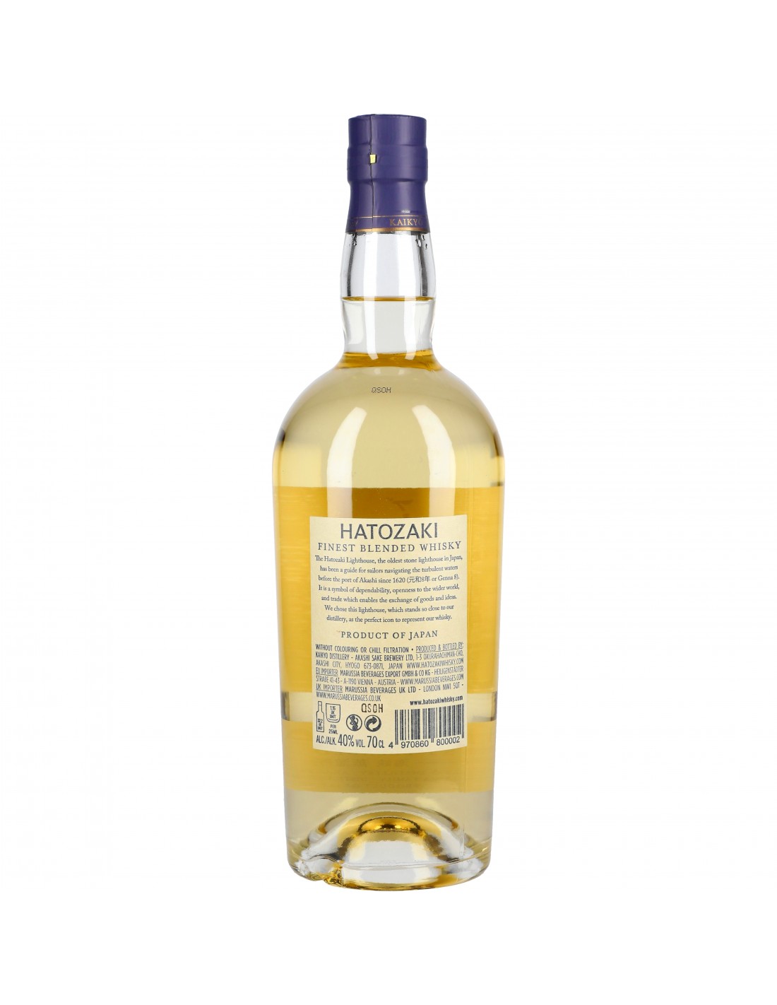 Inspiré par ses voyages et ses échanges avec les plus grands master distillers et blenders étrangers, Kimio Yonezawa élabore ses whiskies avec soin et précision. Le whisky Hatozaki Blended est un blend non tourbé contenant 40% de single malt et 60% de whisky de grain. Tous les fûts importés ont été soigneusement sélectionnés afin de valoriser au mieux le travail d'assemblage. Son caractère affirmé fait la part belle aux arômes maltés avant d’évoluer vers des notes plus céréalières en bouche. Riche et complexe, l’absence de filtration à froid le rend également rond, profond et floral.