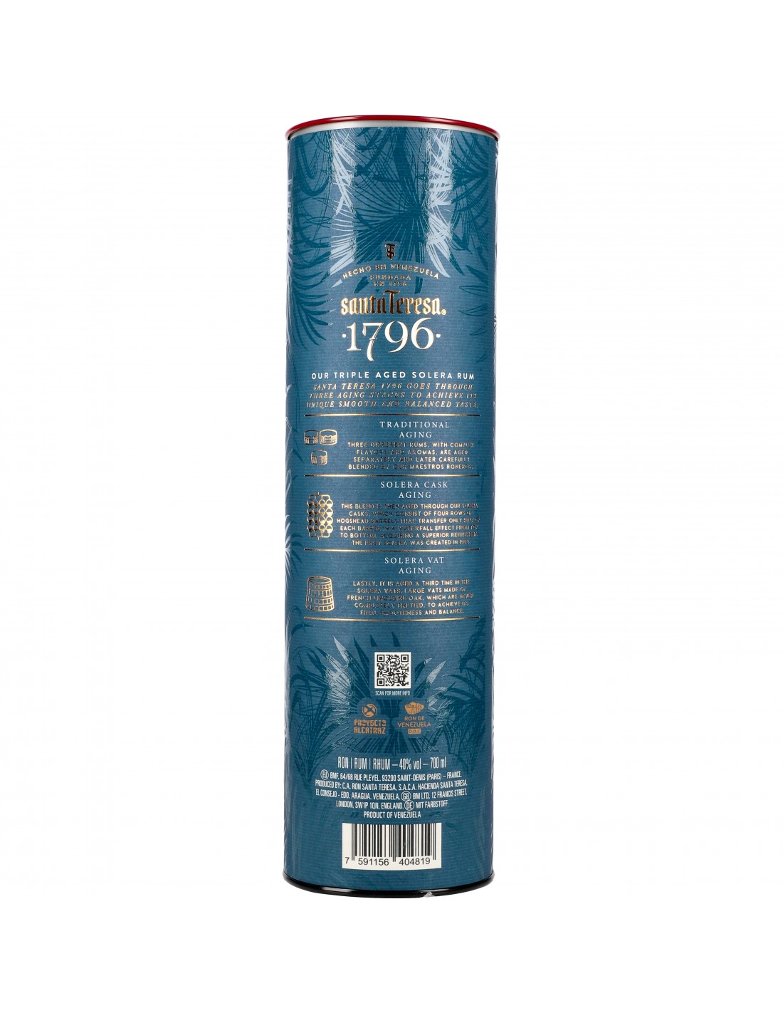 Elu meilleur rhum du monde à plusieurs reprises, Santa Teresa 1796 est élaboré au Venezuela, dans l’Hacienda Santa Teresa. Cette distillerie familiale est l'une des plus ancienne du pays, sa fondation remonterait à la fin du XVIIIe siècle, plus précisément, l’année 1796.Ce rhum d’exception d’une rare complexité assemble des distillats vieillis en système solera, permettant un mélange harmonieux des rhums jeunes et vieux. Ce procédé espagnol empile des fûts sur plusieurs lignes. Dans un long processus, on compense la perte dû à l’évaporation naturelle (la part des anges), par un ouillage (remplissage) du haut vers le bas, les rhums jeunes étant toujours au-dessus. Seuls les fûts au sol (les plus vieux) seront embouteillés. Cette méthode de vieillissement et d’assemblage assure un profil aromatique constant, affine l’alcool et arrondie le corps.