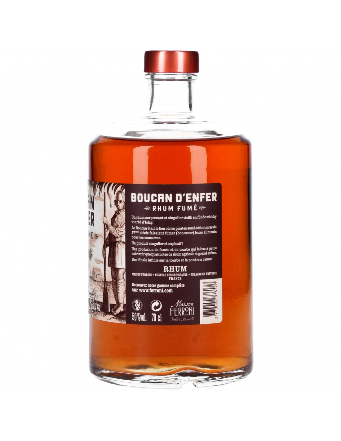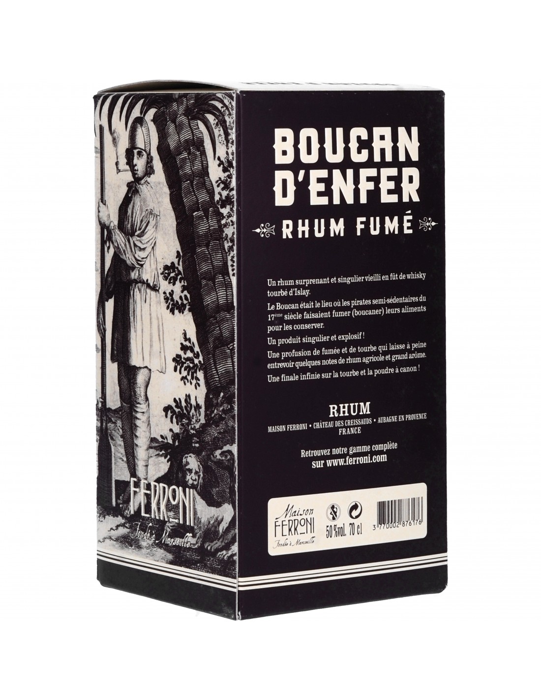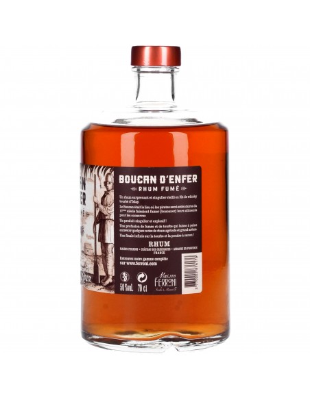 Au XVIIe siècle, les boucaniers profitaient des escales pour préparer leurs victuailles. Dans une cabane appelée « boucan », ils fumaient leurs aliments, une méthode pour la conservation de la viande et du poisson.Élaboré en Provence au Château des Creissauds, un assemblage de 5 rhums (mélasse et agricole) sélectionnés à Trinidad, Guyana, Île Maurice et Martinique. Vieillissement en fût ayant contenu du whisky tourbé écossais provenant de l’île d’Islay.