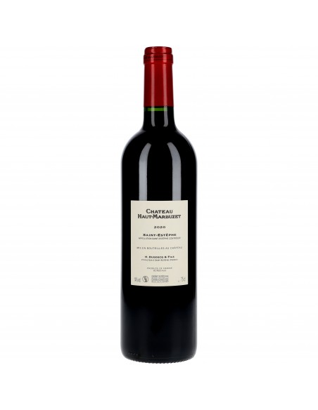 Une robe rouge grenat profond, avec des reflets pourpres. Le nez est complexe et expressif, offrant un bouquet riche de fruits noirs mûrs, comme le cassis et la mûre, associés à des notes de cerise noire et de prune. Des touches de cèdre, de tabac, de chocolat noir et d'épices viennent compléter ce tableau aromatique raffiné. En bouche, le Château Haut-Marbuzet 2020 est puissant et structuré. Les tanins sont fins et bien intégrés, offrant une texture soyeuse et une belle longueur. Les saveurs de fruits noirs et rouges se marient parfaitement avec les notes épicées, florales et boisées, créant une complexité aromatique remarquable. La finale est longue, persistante, et harmonieuse, marquée par des arômes de fruits mûrs, de tabac, de chocolat noir et une légère minéralité, laissant une impression de puissance et de raffinement.