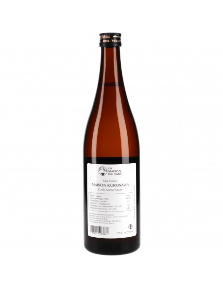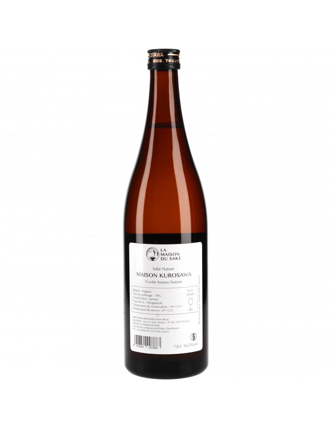Élaboré à partir d’eau, de riz de la variété Hitogokochi, de levures et de koji, Asama Sake Nature reste fidèle au style « Junmai », un Saké exclusivement issu de la distillation de riz, sans ajout d'alcool.L'histoire du saké Kurosawa débute en 1996 aux États-Unis. Jun Tanaka importe des sakés sur le sol américain, en se souciant du goût des consommateurs. Une expérience façonnée au cours de nombreuses dégustations avec des restaurateurs japonais installés sur l’ensemble du pays. Son travail le conduira à entretenir un partenariat avec une ancienne brasserie située dans les montagnes de Nagano, au Japon. Dirigée par la famille Kurosawa, cette maison produira un saké destiné à répondre au mieux aux attentes des consommateurs américains. Cette marque haut de gamme est devenue l'une des plus populaires aux États-Unis.