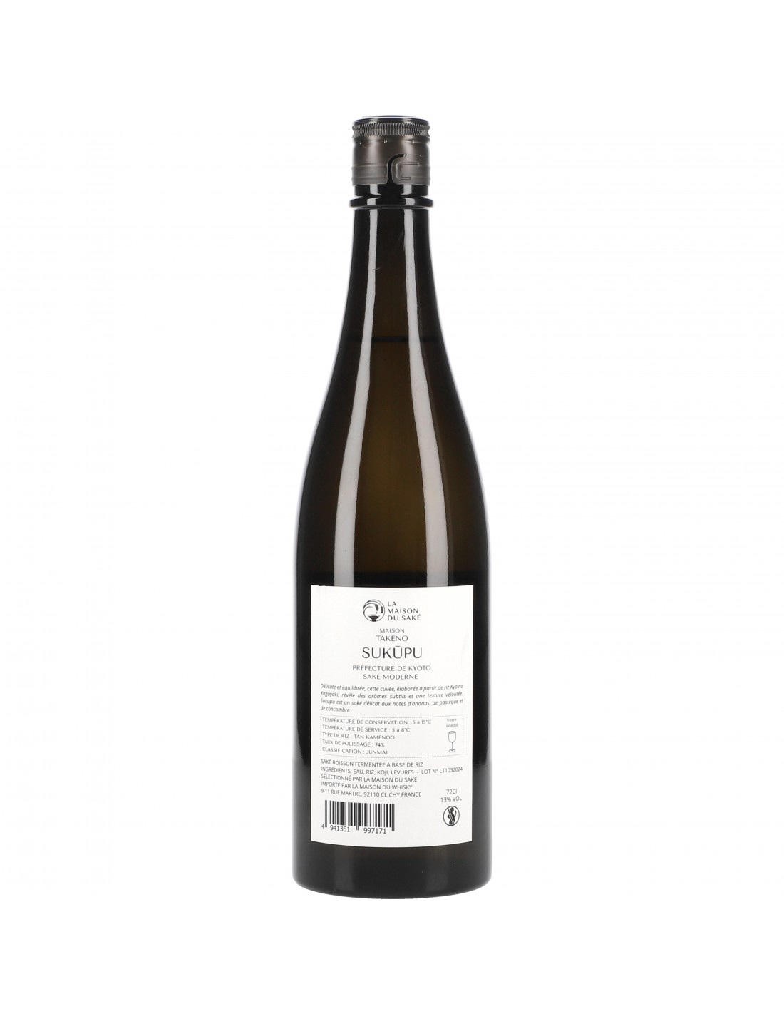 Sukupu est un mot dérivé du terme scoop en anglais. Elaboré à partir d’eau, de riz de la variété Kyo no Kagayaki, de levures et de koji, Takeno Sake propose une déclinaison moderne de l’alcool traditionnel japonais, dans une version délicate et veloutée.Fidèle au style de saké « Junmai », ce spiritueux est issu exclusivement de la fermentation de riz, sans ajout d'alcool.