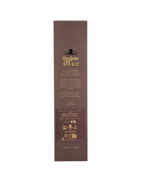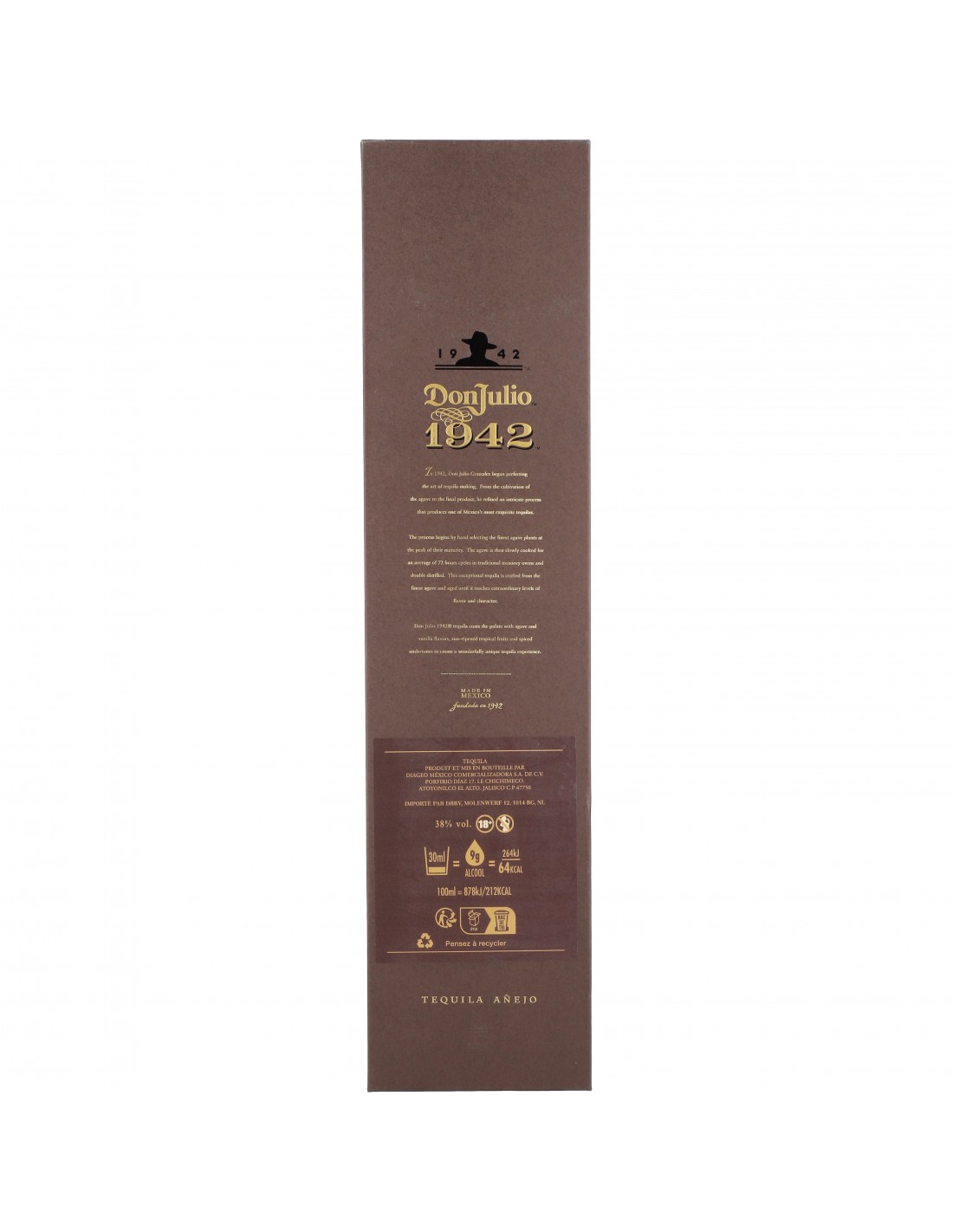 Elaboré en petites quantités à partir de 100% d’agave bleu de la meilleure qualité, une téquila finement épicée, dense et veloutée. Distillation en petit alambics et vieillissement de deux ans et demi en fûts de chêne américain.Né en 1925 dans les montagnes de Jalisco au Mexique, Don Julio González ouvre sa distillerie en 1942 et change les standards de production de la Tequila. Ce maître distillateur augmentera les distances de plantation de l’agave, lui laissant plus d’espace pour pousser et atteindre une pleine maturité.